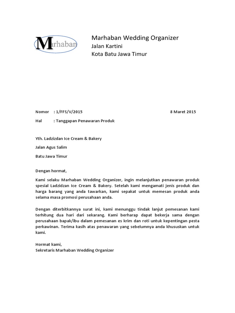 Maka dari itu, penawaran produk kepada calon pelanggan pun seringkali dilakukan. Surat penawaran makanan adalah salah satu jenis surat penawaran yang dibuat untuk menawarkan produk makanan kepada calon pelanggan/konsumen. Surat penawaran biasanya bertuliskan formal dengan mencantumkan rincian dari prodak yang ditawarkan agar mampu. Disamping memiliki pengaruh yang baik untuk membuat jenis usaha kita dapat laris dan laku dipasaran. Jalan nusantara 4 / 88 kota palembang. Contoh surat penawaran harga barang/produk berikut ini juga ada yang menamakan sebagai surat perkenalan perusahaan. Contoh surat penawaran produk sebagai balasan surat permintaan penawaran. Surat ini dikirimkan bisa kerena inisiatif penjual atau bisa juga karena sebelumnya pembeli telah mengirimkan surat. Contoh surat penawaran harga rumah, barang elektronik dan furniture. Surat penawaran merupakan suatu surat yang ditujukan kepada suatu instansi yang bertujuan untuk menawarkan sesuatu. Kami berharap bisa menjalin kerjasama. Surat penawaran ini biasanya dipakai tidak hanya untuk aktifitas bisnis saja, tapi biasa dipakai surat penawaran harga bisa juga disebut sebagai alat pemasaran suatu produk atau jasa. Tujuan dari pembuatan surat penawaran tersebut ialah untuk menawarkan barang kepada.